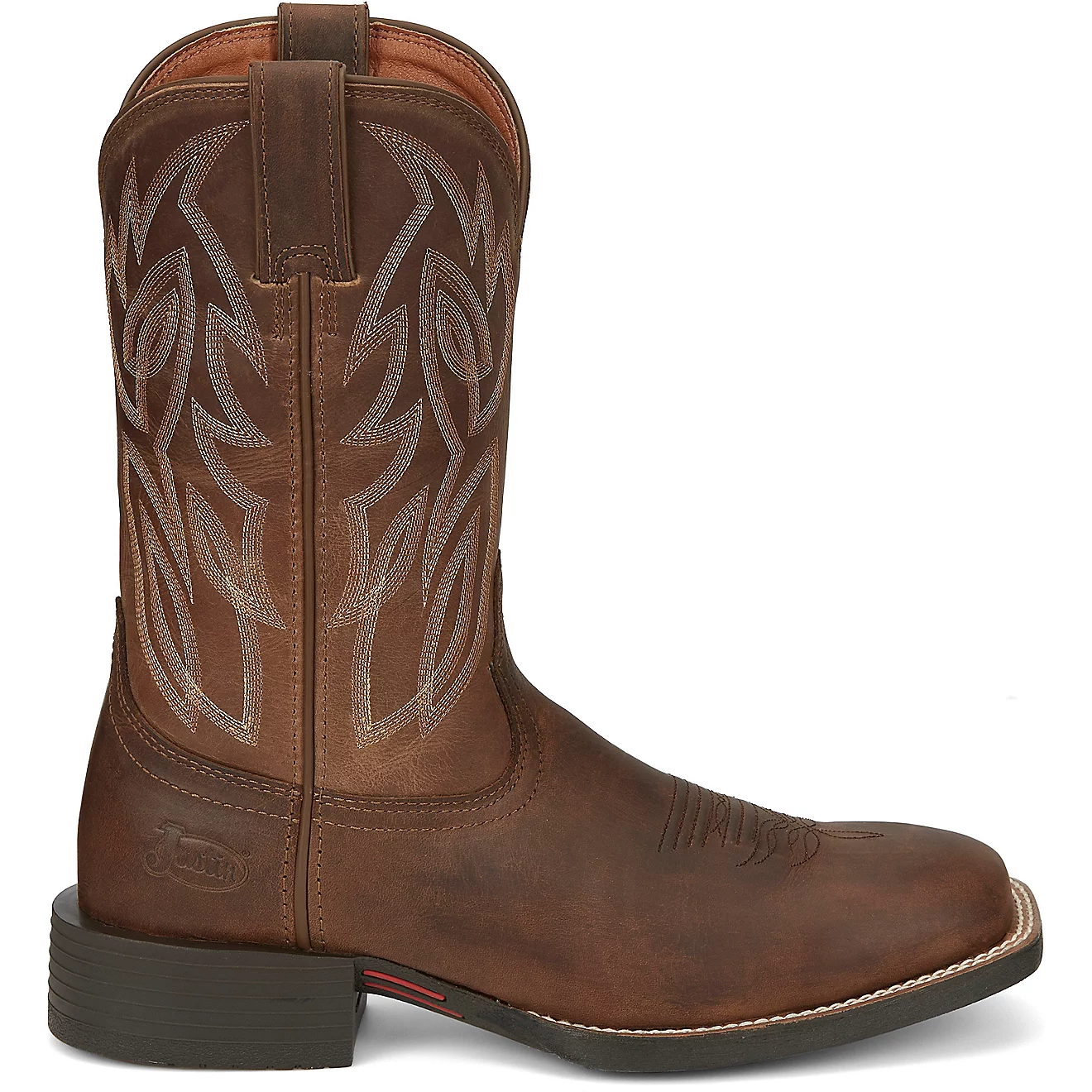 Justin Boots occupies the center of the American western boot market — not the ultra-premium custom boot category, and not the mass-market import category, but the working-cowboy mainstream where boots are purchased to be worn daily in honest use. The Duratread outsole, Justin's proprietary rubber compound, resists oil, abrasion, and the wear patterns of agricultural and industrial use better than the leather sole alternatives that premium bootmakers prefer.