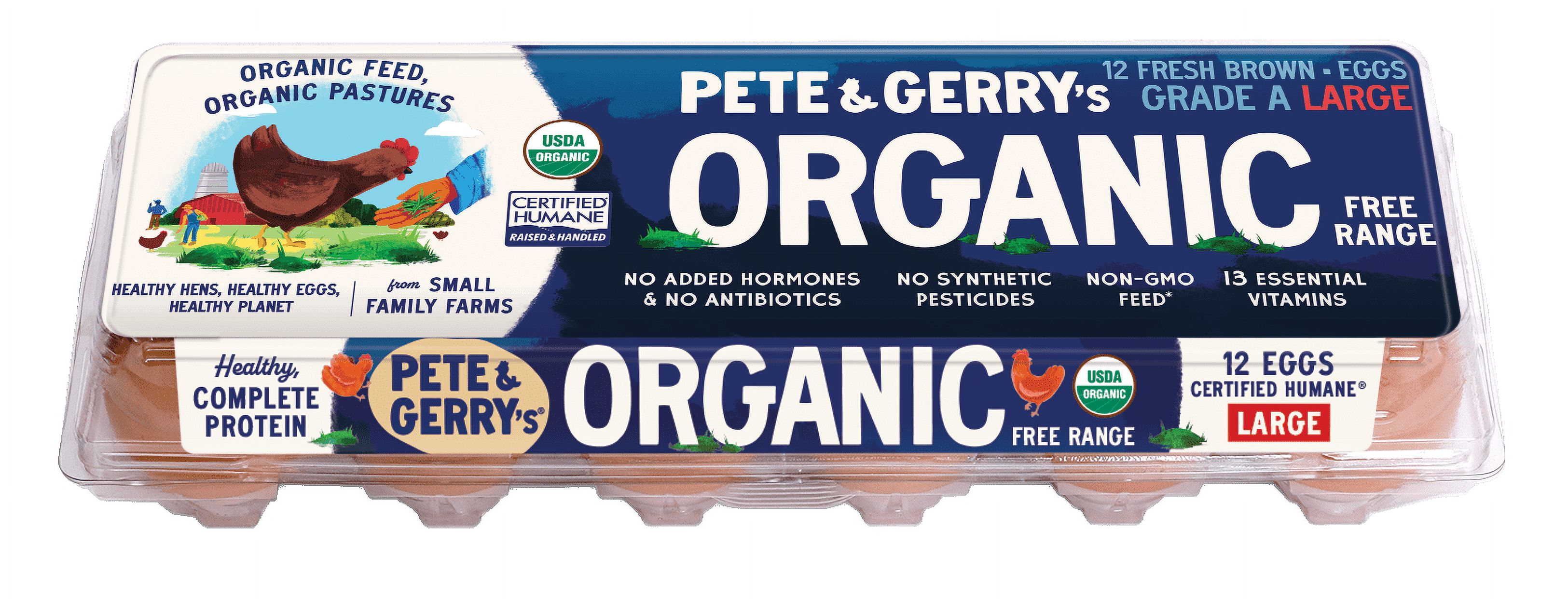 Pete and Gerry's eggs are produced by hens on small certified family farms primarily in New Hampshire and neighboring Northeastern states. Each farm must meet USDA Certified Organic, Certified Humane, and Free Range standards — requirements that specify minimum space per bird, outdoor access requirements, feed standards, and prohibition of antibiotics, hormones, and GMO feed.