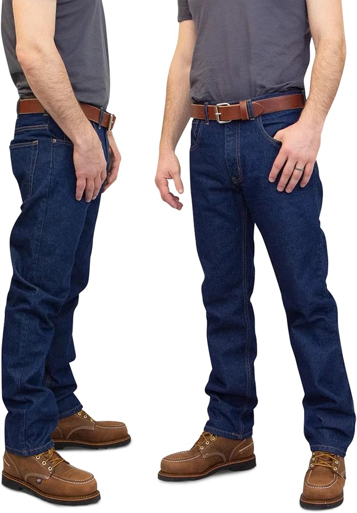Premium 15oz heavy denim jeans with regular fit and tapered leg. Made entirely in USA with American-grown cotton. Gusseted crotch for range of motion. Durable workwear built to last years.
