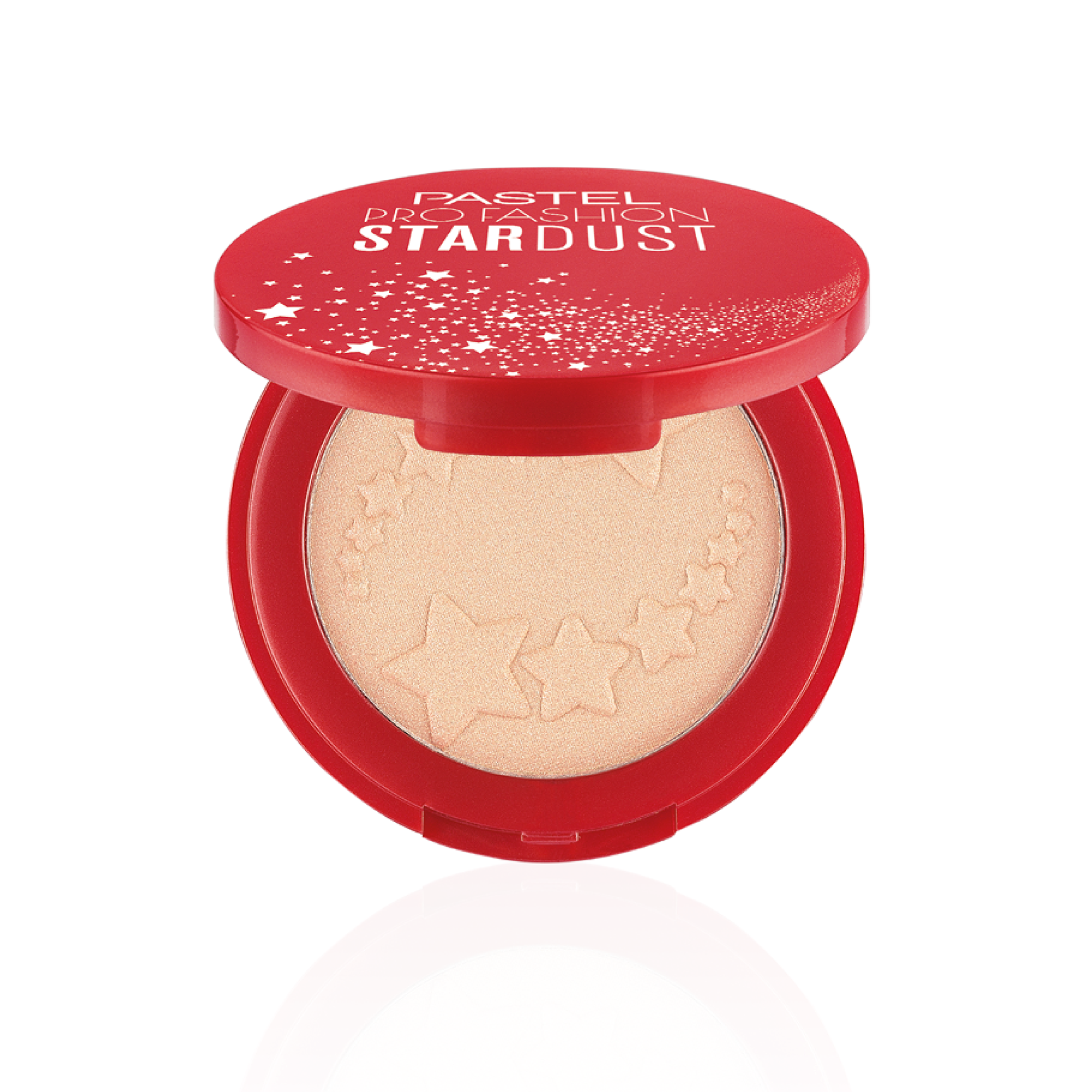 Besame Cosmetics Stardust highlighting powder with golden shimmer. Made in USA. Finely milled powder for luminous glow on cheeks and brow bones. Vintage-inspired compact packaging.