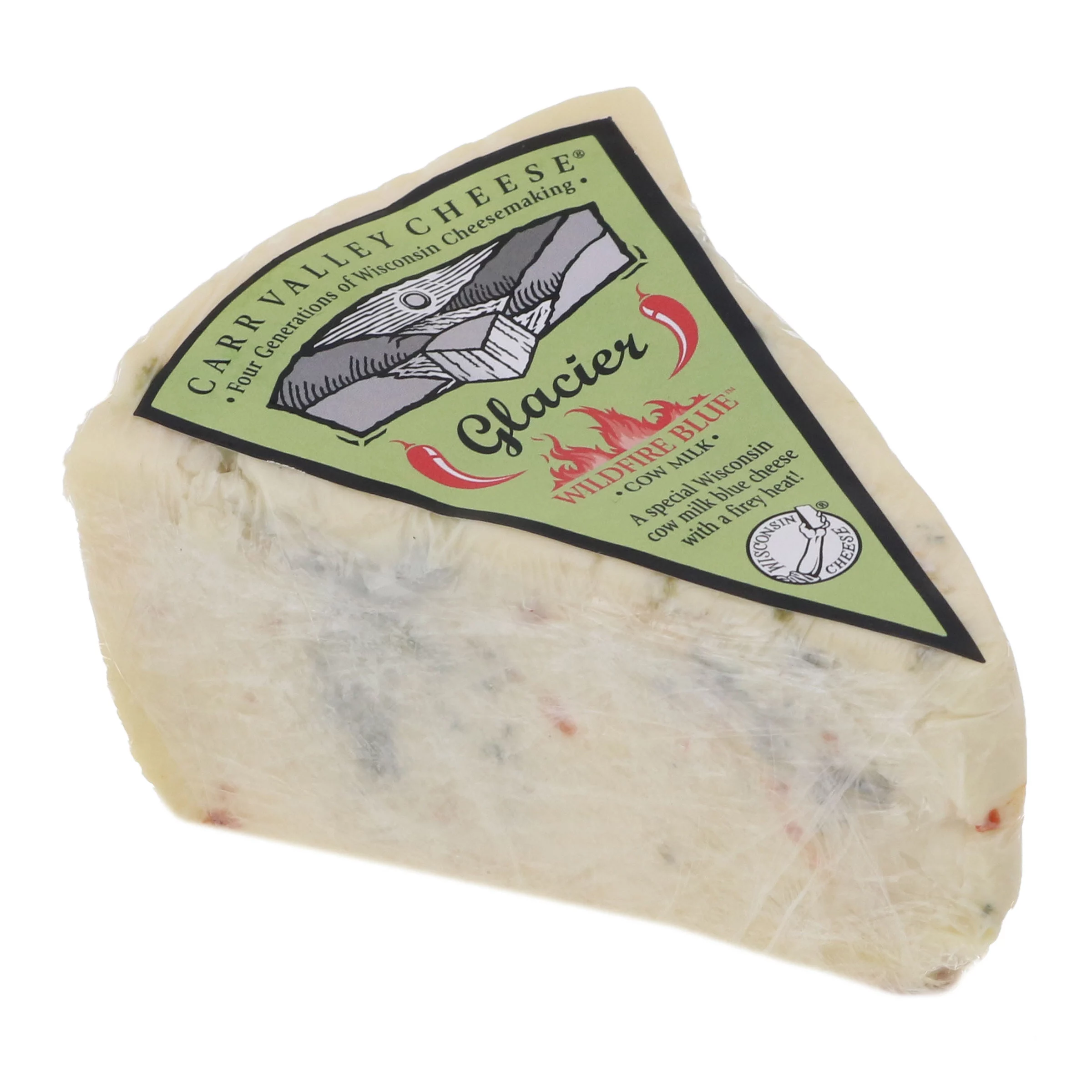 Glacier Wildfire Blue cheese from La Valle, Wisconsin caves. Master cheesemaker Sid Cook creation. Bold blue veining with spicy finish.