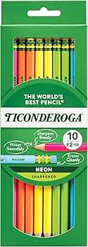 Ten pre-sharpened #2 HB pencils in bright neon barrel colors with matching erasers. Same premium Ticonderoga graphite core in a fun design. Made in the USA.
