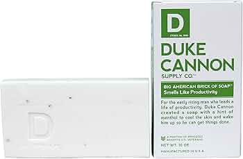 Large 10oz mint-scented bar soap. Made in the USA by Duke Cannon Supply Co. Invigorating mint scent for a productive start to the day.