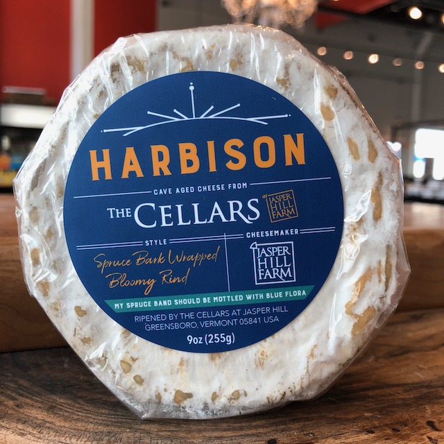 Harbison soft-ripened cheese wrapped in spruce cambium. Made in Greensboro, Vermont. Bloomy rind with spoonable paste.
