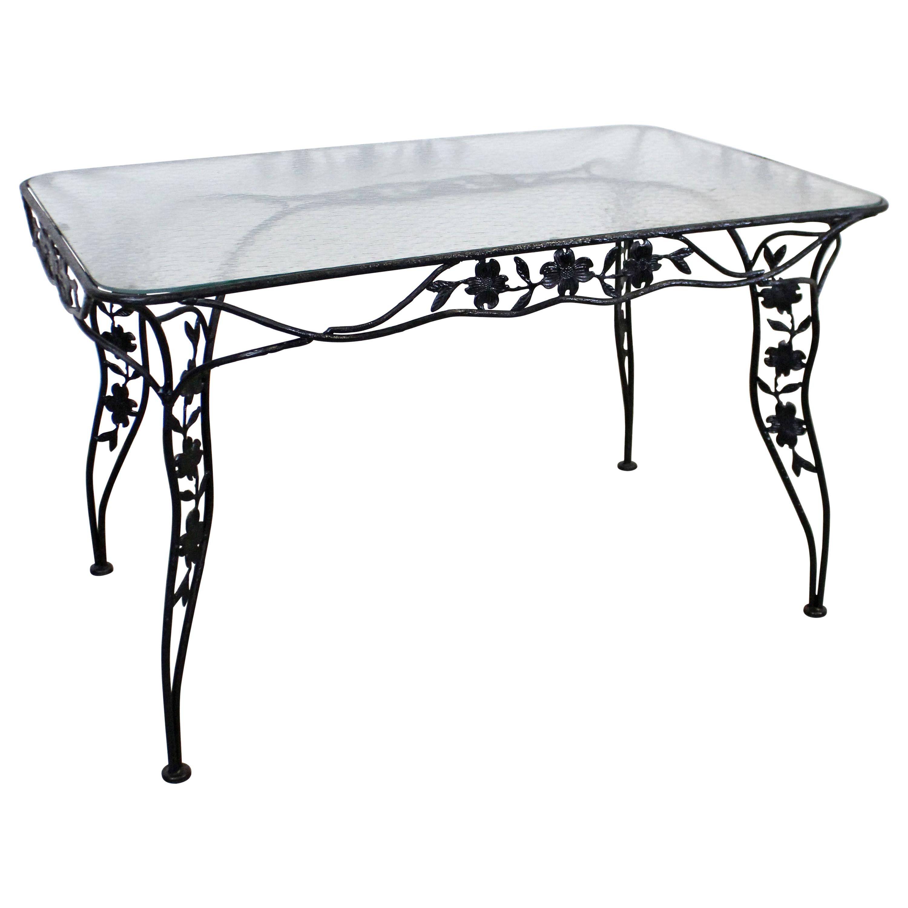 Wrought iron side table made in Birmingham, Alabama. Traditional dogwood pattern craftsmanship. Powder-coated black finish for lasting outdoor durability. Perfect companion for patio seating.