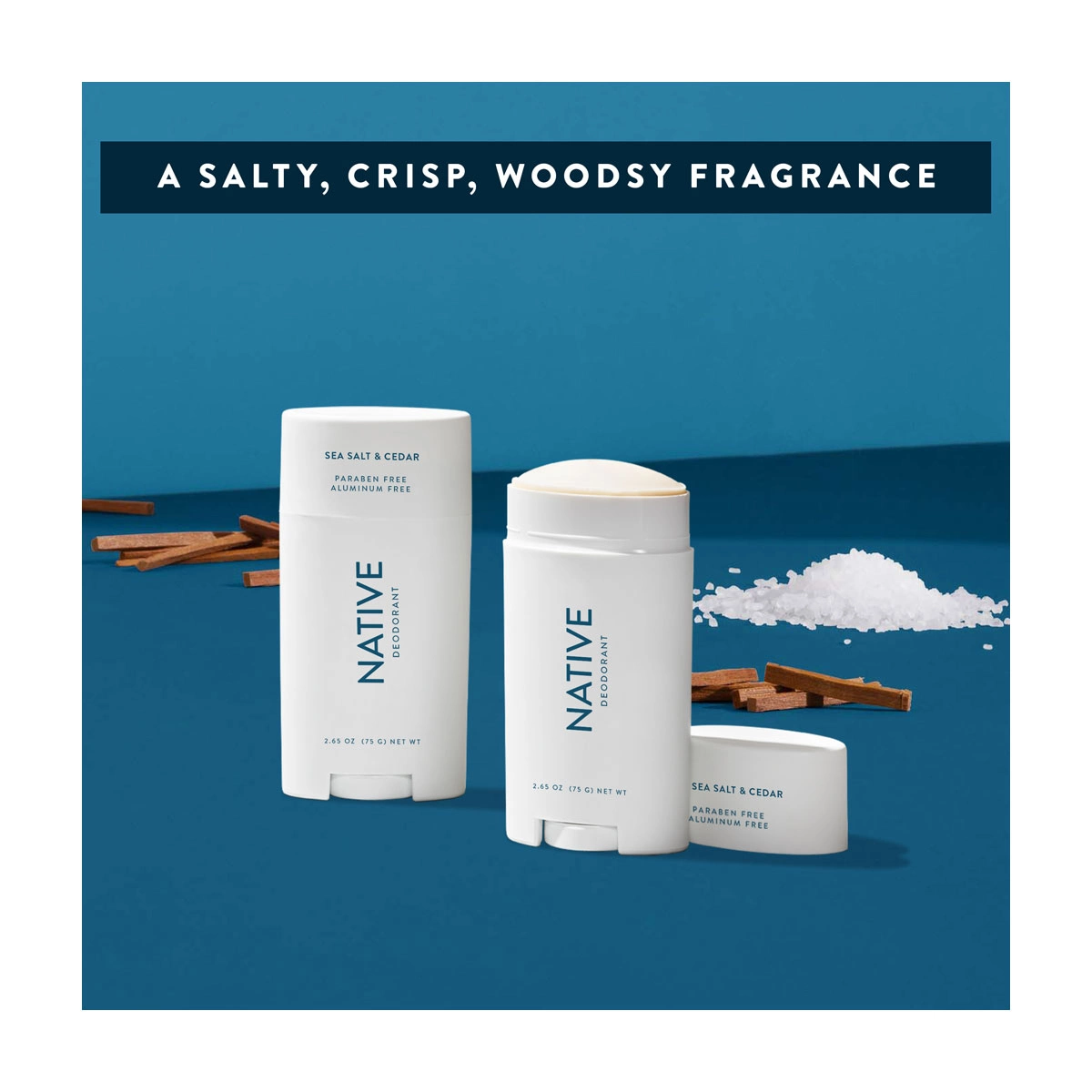 Sea salt and cedar natural deodorant. Made in the USA by Native. Clean ingredients, aluminum-free formula.
