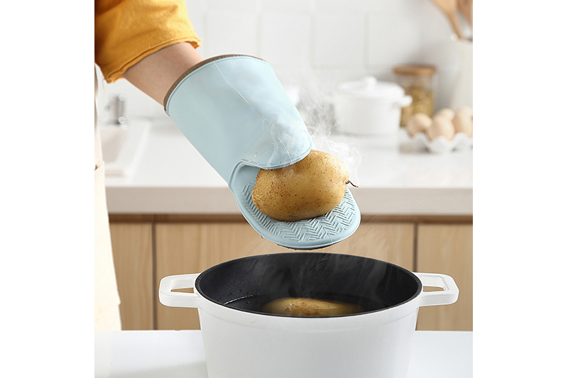 Heat-resistant silicone oven mitts with quilted cotton lining. Protects to 450 degrees F. Textured grip surface. Tested and designed by Norpro in Washington state.