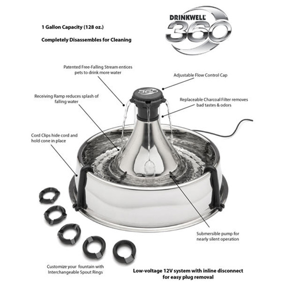 360-degree stainless steel pet water fountain. Made in USA. 1-gallon capacity, carbon filter, quiet pump.