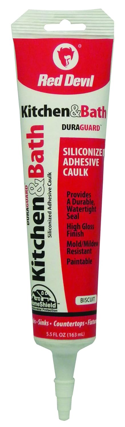 Siliconized acrylic caulk for kitchen and bath from Red Devil American manufacturing. Mildew resistant and flexible.
