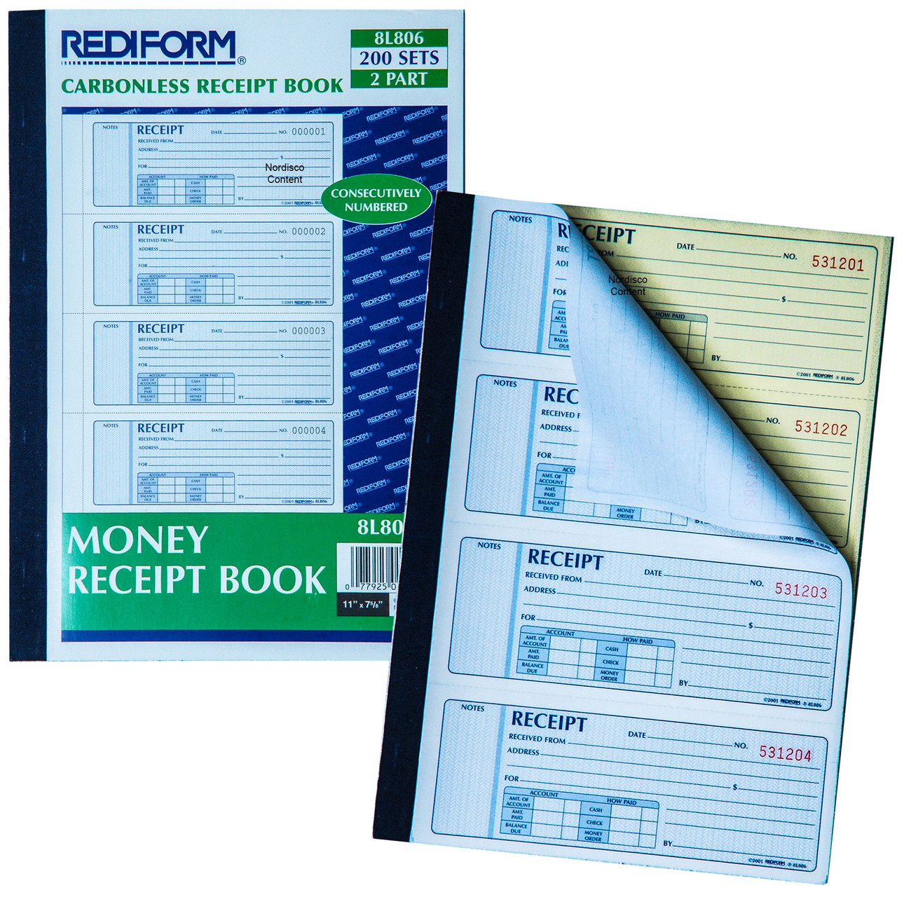Money receipt book 2-part 200 receipts per book. Rediform Elyria OH. Pre-printed with date, received from, and amount fields. Sequential numbering.