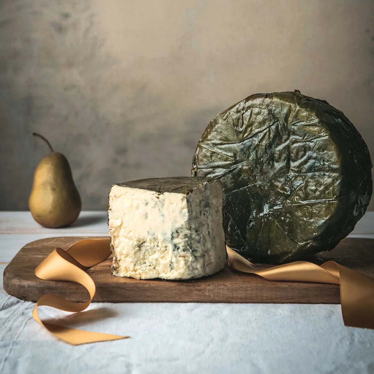 Rogue River Blue wrapped in Syrah-soaked pear leaves from Central Point, Oregon. Named Best Cheese in the World at 2019 World Cheese Awards.