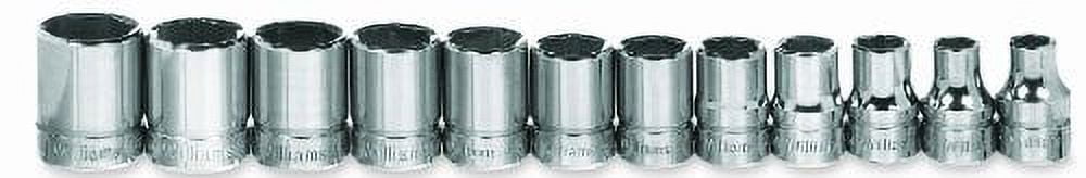 12-piece 3/8-inch drive socket set in hard shell case. Chrome finish sockets. Industrial-grade quality from Snap-on's Williams brand. Made in the USA.