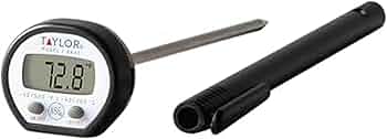 Digital instant read meat and food thermometer with LCD display. Temperature range of -40 to 500 degrees Fahrenheit. Quick one-second readings for accurate cooking. Made by Taylor Precision Products.