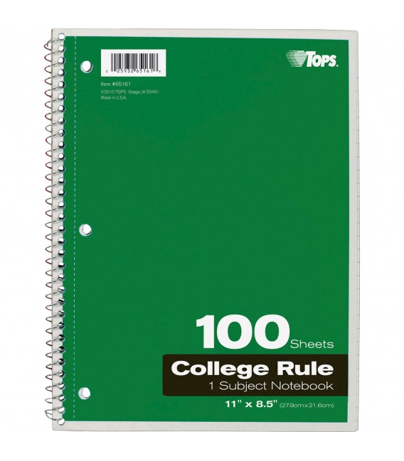 College-ruled spiral notebook for school and office use. Made in USA. 8.5 x 11 inch, 100 sheets per book, 3-pack. Perforated pages tear out cleanly. Quality TOPS paper for smooth writing.