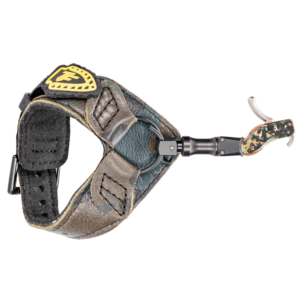 Tru-Fire Hardcore buckle foldback wrist strap release made in Superior, Wisconsin — a heavy-duty compound bow release with adjustable trigger travel and spring-loaded jaws for bowhunters.