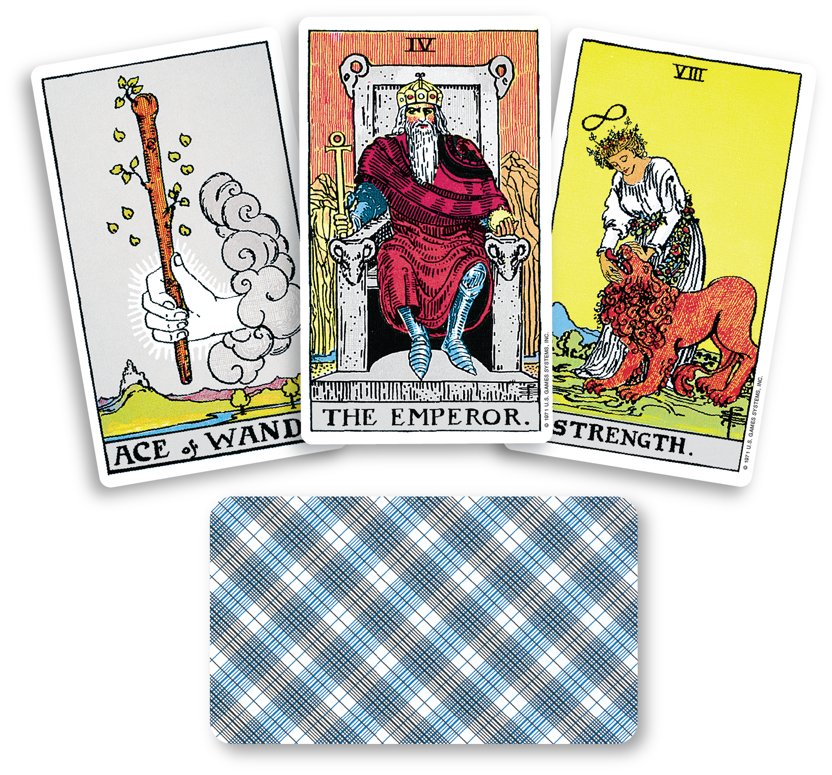 The classic Rider-Waite tarot deck, the standard reference for tarot worldwide. 78 cards with booklet. Published by U.S. Games Systems in Stamford, CT.