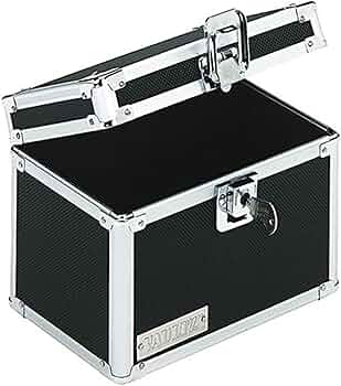 Locking 4x6 index card storage box holds 450 cards. Key lock with steel corners, aluminum reinforcement, and soft felt interior. Alphabetical dividers included.